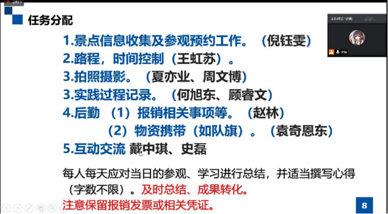 在实践准备部分,带队汪老师既强调了包括必备的行李等物质准备,也强调了树立责任意识与安全意识等精神准备。同时,队长也将实践队分为几个小组进行具体细致的任务分工,让每一位成员在队伍中既能发挥特长又能得到锻炼,确保最终能够实现汪老师所强调的实践成果的及时转化。