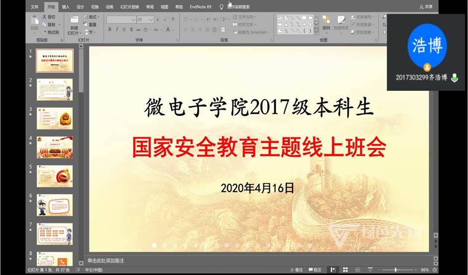 接着,在4月16日,黄老师组织2017级学生召开了国家安全教育主题“云”班会,全年级70余名学生参加会议,会议由黄老师主持。班会主要围绕以下三方面内容展开。