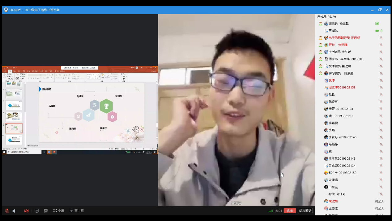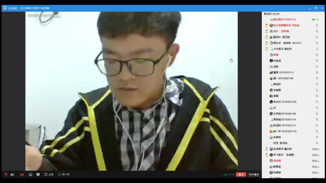 学习委员陈展鹏同学讲述了居家线上学习该如何达到更好的效果,并强调了学习心态的重要性,提醒大家虽然居家学习舒适也不可过于放松,面对新学习方式带来的一些问题也要积极克服,努力达到同在校学习相同的效率。其组员也提出了在家学习遇到的许多问题——独自学习缺少动力、设备问题降低学习效率等,但都表示会认真克服,希望尽早回到学校。组员赵广宇同学也同大家分享了许多学习软件,以帮助同学们更好地管理学习时间。