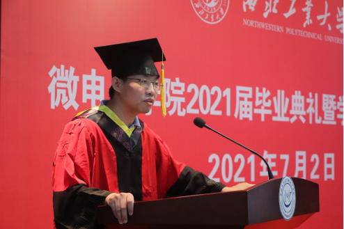 典礼第二阶段,学生代表发言:齐浩博同学作为毕业生代表发言,他回望了在工大的四载求学之路,并感谢学校及学院对自己的培养与栽培。他表示,在今后的人生征程中,将铭记师长的教诲,用实际行动践行工大学子应有的责任与担当。