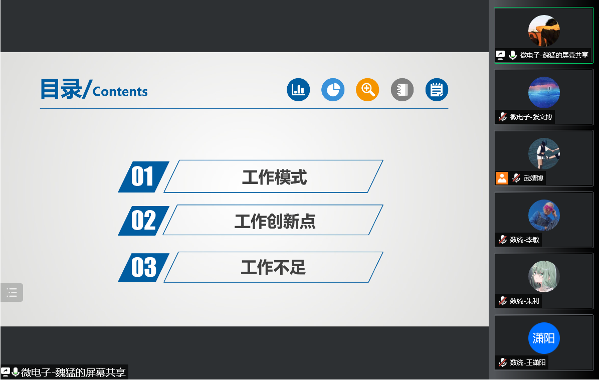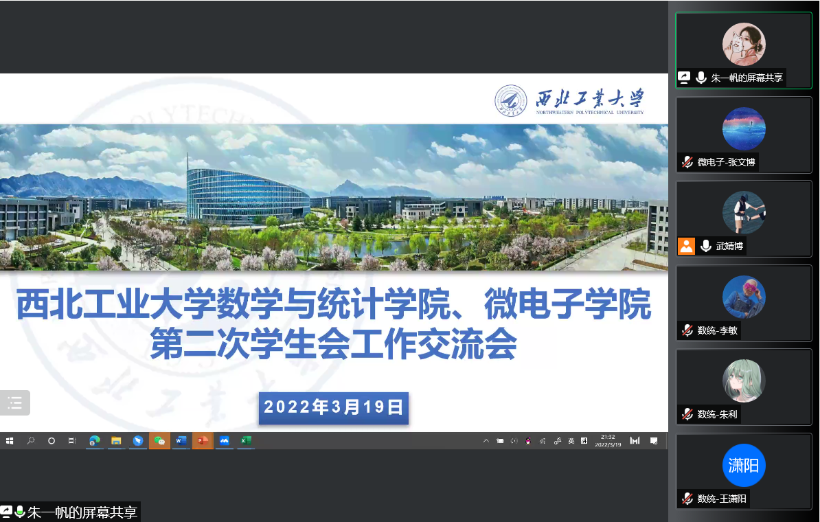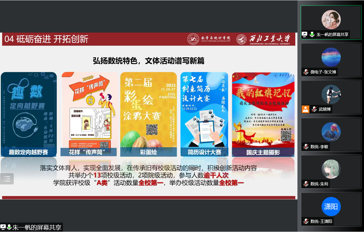 首先,由数学与统计学院主席团成员朱一帆介绍数学与统计学院学生会相关工作。朱一帆介绍了数学与统计学院学生会在思想政治引领及学生会内部改革方面的成果,阐述了新学期的四个工作重点:思想引领、权益服务、文体活动和宣传四个方面,。接着,朱一帆介绍了数统学院学生会工作的创新点,包括组织学生会内部定期开展述职答辩、开展“茁旸计划”、开设“每日一题”栏目、举办经验分享会、在传承旧有校级活动的同时开展创新文体活动等。