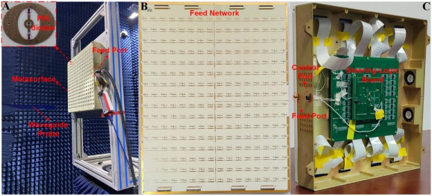 聚焦上述关键问题,研究团队提出了数字超构表面的馈电调相一体化集成设计方法,深入开展了自激励数字超构表面的动态高精度电磁辐射调控研究,通过采用高效率微波集成馈电网络替代传统空间激励馈源的方法,融合数字超表面技术、相控阵天线技术与匹配滤波器设计等多种手段,在进一步提高数字超构表面效率的前提下,大幅度降低系统整体剖面高度约两个数量级,实现了低副瓣大角度扫描和动态多模涡旋波激励。该项研究成果对推动数字超构表面领域的前沿技术发展具有重要意义,同时也为发展高精度高性价比的新型轻量化相控阵系统提供强有力的技术支撑。