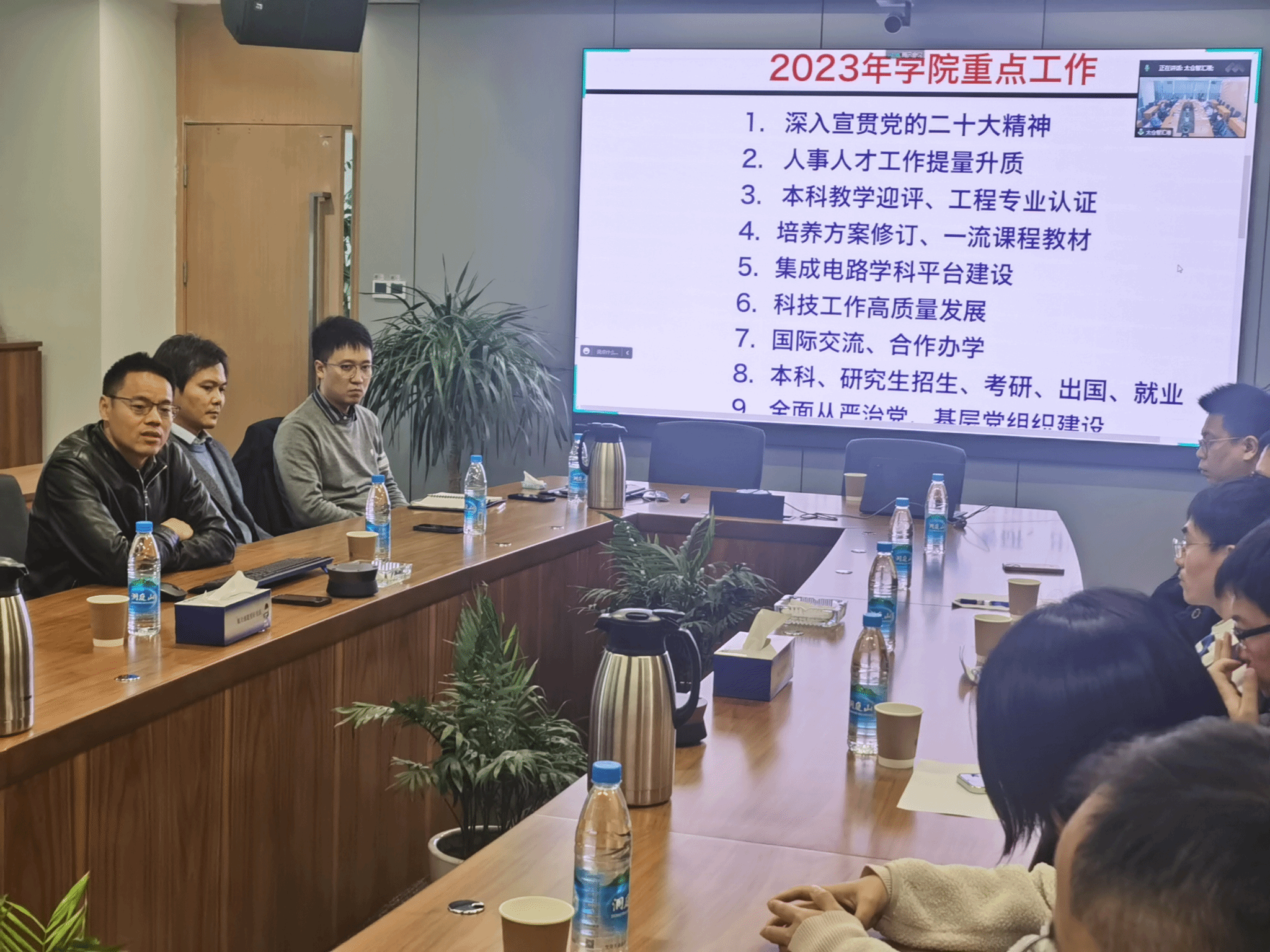 甘雪涛介绍了2023年学院工作要点制定的背景和意义,从深入宣传贯彻党的二十大精神、人才工作提量增质、本科教学迎评、工程专业认证、培养方案修订、一流课程教材、集成电路学科平台建设、科技工作高质量发展、国际交流、合作办学、本科研究生招生、考研、出国、就业、全面从严治党、基层党组织建设等方面系统解读了今年学院的重点工作任务。