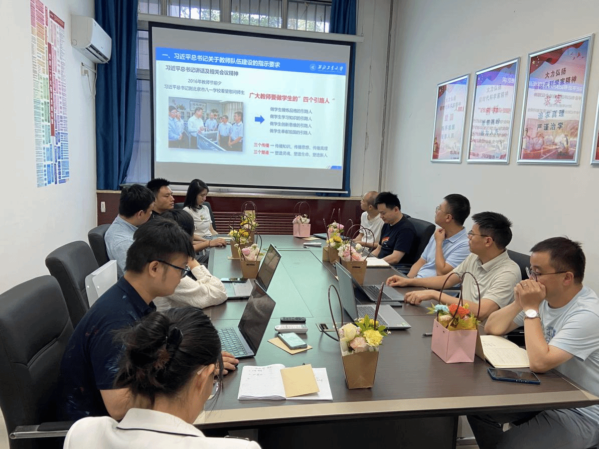 师德师风建设,深入推进师德专题教育,甘雪涛带领与会教师进一步学习了习近平总书记关于教育的重要论述,重温了《新时代高校教师职业行为十项准则》,呼吁全体教师作为教师要正确认识教书育人的岗位职责,应敬畏课堂,注重细节,认真负责地讲好每一堂课。同时,要积极探索思政元素与课堂教学有机结合的工作路径,为国家培养出有爱国情、报国志的卓越人才。在座谈交流环节,参会教师畅所欲言,分享教书育人的感悟与荣光。