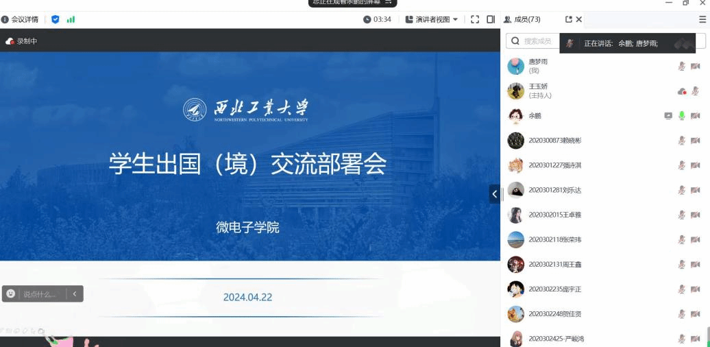 余鹏首先介绍了学院进一步加强学生出国(境)工作的背景和重要意义,指出学院努力为同学们搭建优质的出国(境)交流平台和渠道,给予全力条件保障,不仅是为了进一步提升同学们专业素养,更是培养同学们全球视野和家国情怀的重要途径,为“总师”型人才培养提供重要支撑。随后,会上介绍了学院本学期重点官方项目——澳门大学集成电路研学项目的基本情况,重点就过程管理和下一步重点工作进行了部署。