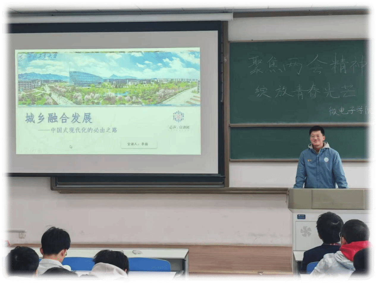 图2 周墨涵为同学们介绍两会 图3 李喆宣讲城乡融合发展