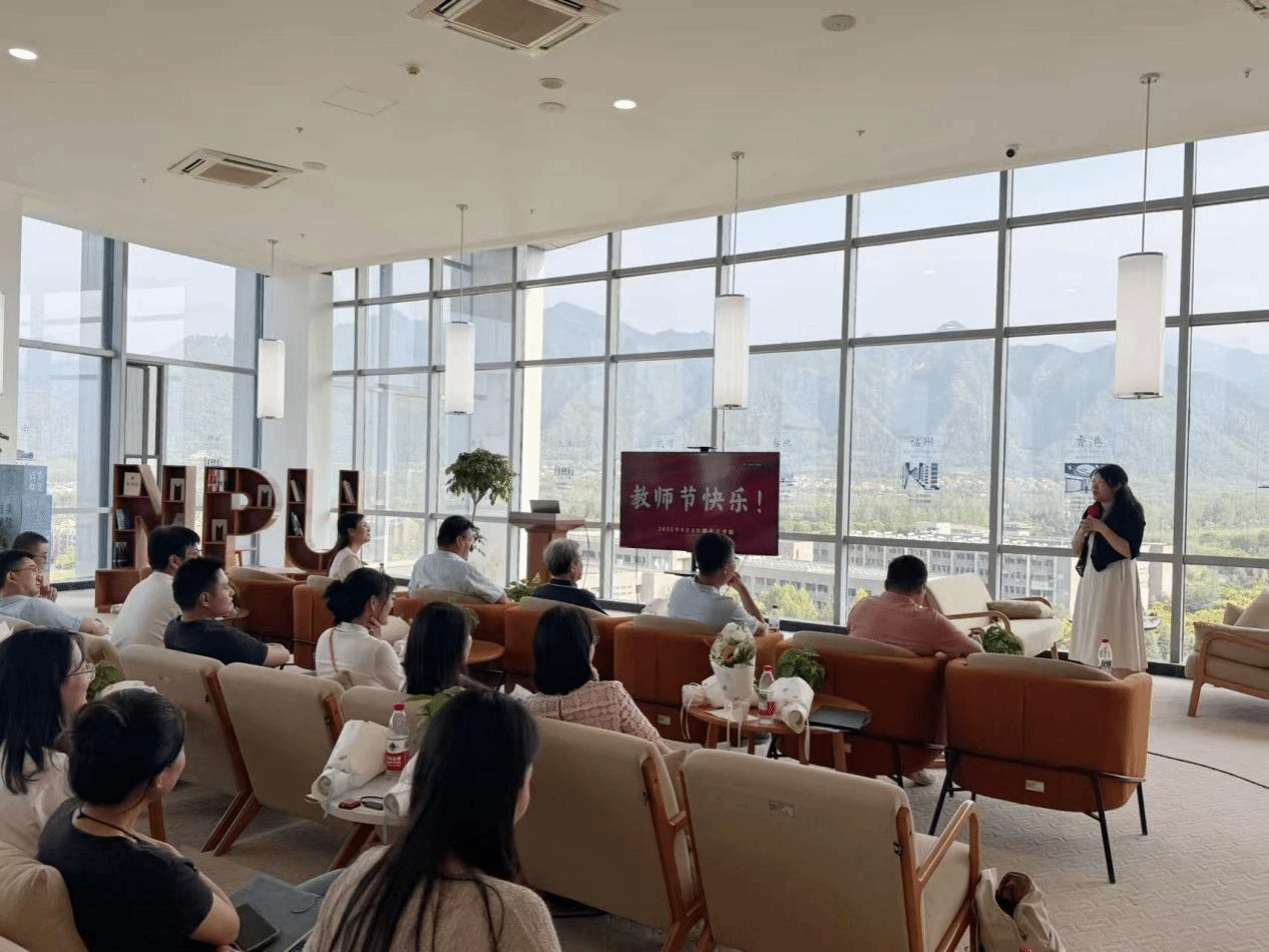 在图书馆云上书阁召开庆祝教师节座谈会。学院领导班子、长安校区二十余名教职工及学生代表参加了会议,太仓智汇港教师线上参会,座谈会由学院党委书记杨妮花主持。