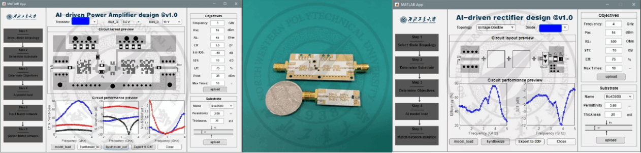 图:从左到右依次:功放设计APP、APP设计的实物、整流器设计APP