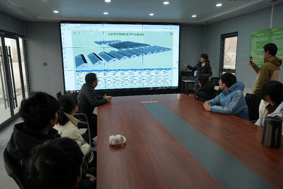 座谈会结束,在中心工作人员的陪同下,实践队前往长安区长松翠竹现代农场开展实地参观。农场工作人员袁福琴详细介绍了农场的智能化建设情况,重点讲解了智能化监控监测系统、水肥一体化控制设备的运行情况。