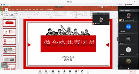 为深入学习贯彻习近平新时代中国特色社会主义思想,推进“两学一做”学习教育常态化制度化,2020年12月13日晚,欧美色情片 2020级全体团支部通过线上会议对学生团员开展基本理论、基本知识以及优良传统的教育培训活动。本次活动由2020级大团支书周岸霄主持,学院团委书记、2020级学生辅导员汪钰成老师和2020级全体本科生参加。